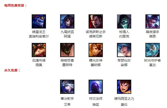 另外,在中国的服务器中,我们额外增加了三个永久免费的英雄——寒冰射手艾希、德玛西亚之力盖伦和符文法师瑞兹。这三个英雄是永久免费供所有玩家使用的。主要目的也是便于那些刚刚打完新手实战训练营的玩家能够至少有一个自己会用的英雄。