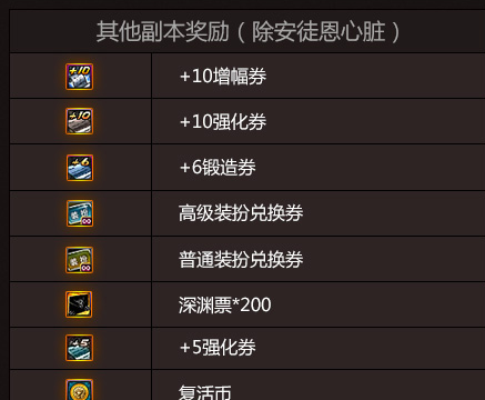 一共有6个副本,每过一个副本都可以获得图中的奖励中的任意一个。最后完成安图恩心脏副本的话,就可以获得专属的安图恩副本奖励。