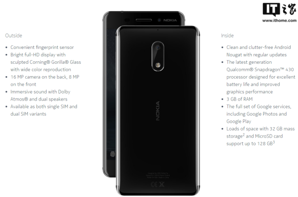 而页面最下方的细节图则说明了一切,新配色与现有的哑光黑不同,采用了高光材质,机身背面拥有独特的玻璃质感,值得一提的是,这款亮黑色配色的诺基亚6还是限量版。