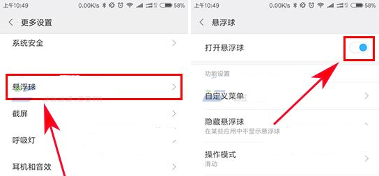 2、接着点击【悬浮球】,进入后把【打开悬浮球】对应的开关开启,再根据需要设置其他选项就行了。(如下图)