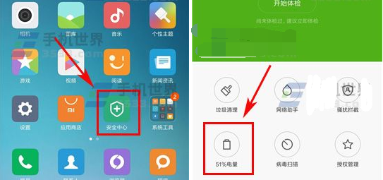 1、首先打开手机自带的【安全中心】,打开之后点击电量电池图标。(如下图)