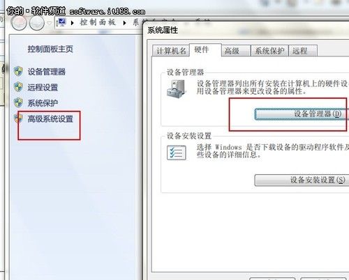 2、在桌面右键“计算机”,在快捷菜单中选择“管理”,在左面导航栏中选择“设备管理器”的电脑,在里面选择“设备安装设置”。