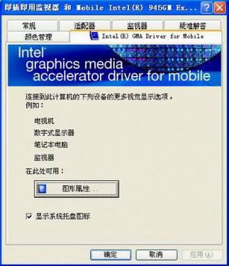 ,选择“图形属性”,也可以进入以上所说的设置界面。此外还可以通过其他方式(如右键单击桌面等等)进行设置,都能达到你的要求。如果把任务栏没有Intel的图标,请按如下方式进行点击:开始--控制面板--显示--设置--高级--Intel(R) GMA driver for Mobile,在“显示系统托盘图标”前面打上勾即可。