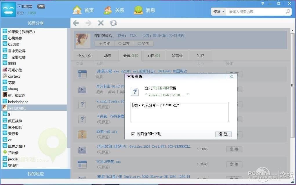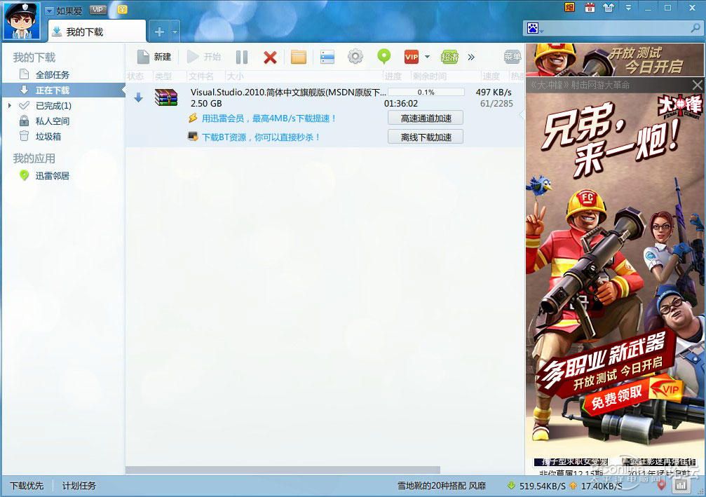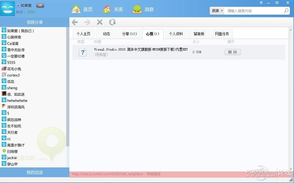 接着就是按部就班的把一些经常用的应用软件都安装了下。正准备蹭个公司的网络,通过迅雷邻居找几部好电影下载下来留着晚上回去看的时候,竟然发现有个哥们儿分享了VS 2010,顿时一阵鸡冻。