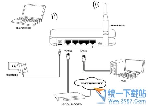 2、建立广域网连接。用网线连接路由器和xDSL/Cable Modem或以太网。(如图1)