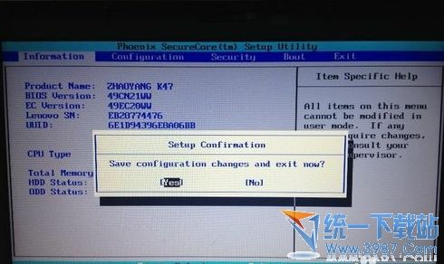 当我们对电脑的BIOS设置完成以后,可以按键盘上的“F10”保存当前配置并且退出BIOS程序,如下图所示