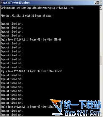 2.出现网络中断后,此时在PC机上ping ADSL Modem网关(192.168.1.1),表现为大量丢包或完全不通。如下图所示: