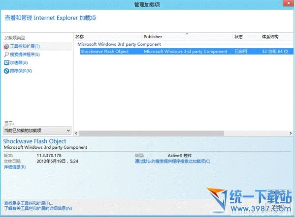 1. 出现这个情况,首先我们可以确认Shockwave Flash Object加载项是否已启用,若是启用状态,再检查IE10是否打开了Active X筛选。