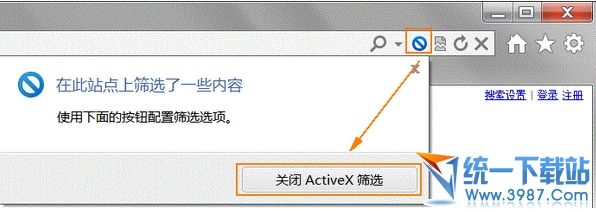3. 这样的话,单击地址栏上面的禁止图标,在弹出的提示框中单击“关闭Active X筛选”按钮即可,这样即可单独关闭对此网站的Active X筛选。