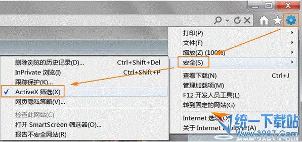 4. 如果你想在所有网站中禁用Active X筛选,那我们只要在IE10工具中的安全选项中取消Active X筛选前面的勾即可。