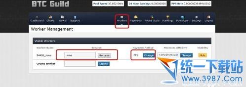 2、登录账号之后,点击work。然后在这里设置一个挖矿账号。账号的形式是 用户名_矿工名构成的。你只要填写矿工名即可。另外这里这里有两种支付方式,如果你的挖矿软件无法挖矿可以换一种“Payment Method”试试。