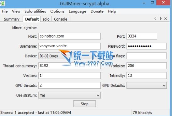 为了方便,我们继续用上面coinotron的账号。打开GUIminner,将自己的矿工名字和矿工密码输进去,端口输入3334,调到适合自己电脑的GPU参数即可运行。更多内容关注西游通。