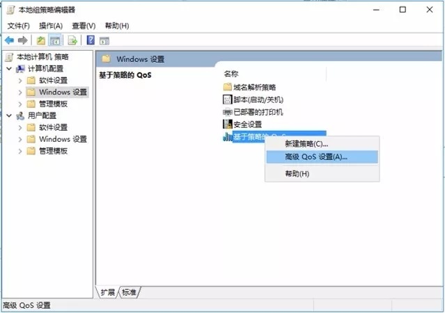 三、接下来右键单击【基于策略的 Qos】,在弹出的菜单中选择【高级 Qos设置】。