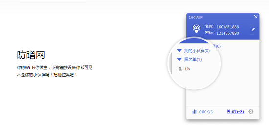 之后安全性,160wifi考虑的非常到位。如果你想要蹭网,那么160wifi只能跟你说抱歉了,使用160wifi的用户,可以清楚的看到每一台链接到你wifi网络当中的设备,不认识的设备,可以将其拉入到黑名单当中,对蹭网的人说一声再见。