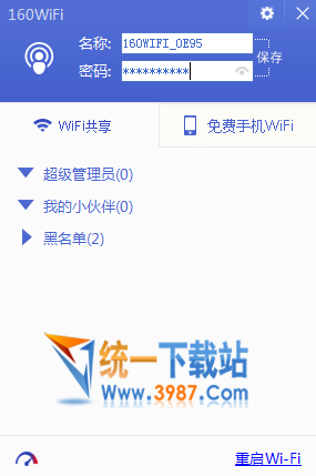 密码修改,随心所欲。160wifi客户端右上角修改字面,可对该wifi名称和密码自定义修改,密码修改旁边可选择屏蔽,即修改密码的时候没有直接显示出来内容。随心所欲,想做就做,但是切记不要设置太简单,以免被隔壁”老王“自动连上!