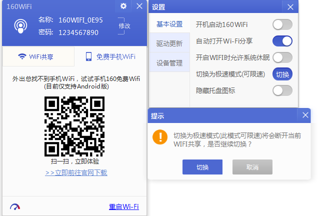 160wifi,极速模式,畅享体验,快人一步,实现飞跃。打来160wifi右上角齿轮状的设置键,进入设置页面后在基本设置处选择切换“极速模式”(界面如图3)。需要注意的是,转换模式期间会断开wifi共享。此时网速已经达到不一样的级别,更多设置可以造成不一样的惊喜!