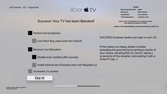 苹果Apple TV 4 的越狱工具 LiberTV 正式发布,下面一起来学习如何利用这个工具对 Apple TV 4进行越狱。详细步骤( 据悉目前这一版本的 Apple TV 4 越狱工具只支持 tvOS 10.0-10.1, 对 tvOS 9.1 的支持可能会在稍后时间到来)