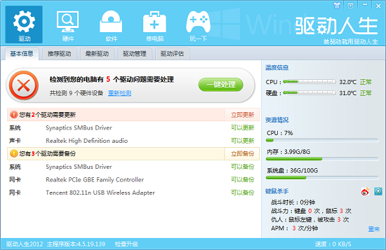 继驱动人生2010备受欢迎的情况下,驱动人生带来了其最新版本驱动人生2012,该版本不仅仅在界面的风格上更加简约,而且驱动人生还可以将检测提到主程序上进行,增加了温度信息和鼠标杀手等贴心的小工具。贴心的避免了首屏展示咨询广告,集中了驱动管理等功能,让用户的使用得到了一个很好的提升。