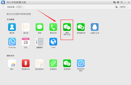 第二步:接下来就跳转到恢复界面了,我们看到有很多数据项图标,说明这些都是开心手机恢复大师可以恢复和备份的数据,现在我们找到“微信聊天记录”图标进行点击,然后软件就开始对手机进行扫描分析了;