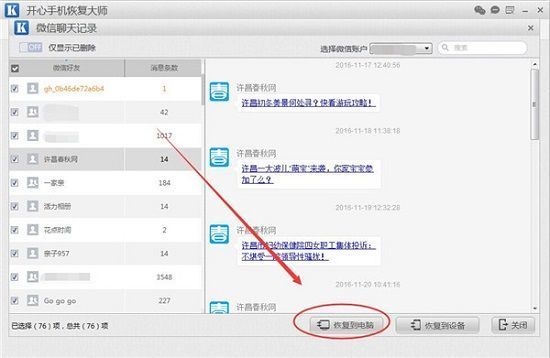 第四步:今天我们是想备份iPhone的微信聊天记录,所以勾选出所有想备份的微信记录数据,然后点击右下角的“恢复到电脑”,再点击“浏览”,选择一个保存路径,就可以把这些微信记录导出到电脑上形成备份保存了。