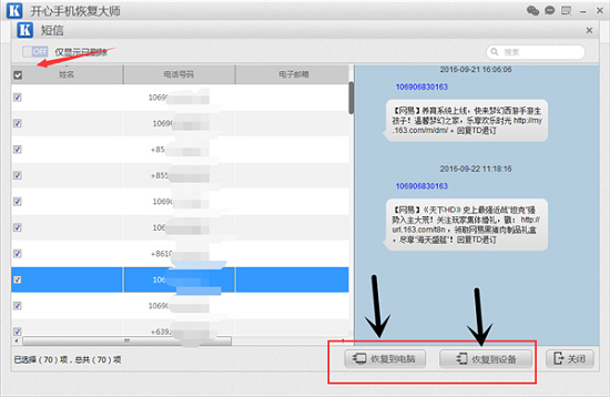 步骤四:短信预览界面分为左右两部分,左侧为联系人信息,右侧为对应联系人所发的短信记录,其中显示为橙色字体的就是已删除的短信。勾选需要恢复的短信记录,然后点击右下角的【恢复到设备】即可恢复到iPhone手机中(需要关闭“查找我的iPhone”功能);点击【恢复到电脑】也可以恢复保存到电脑中。