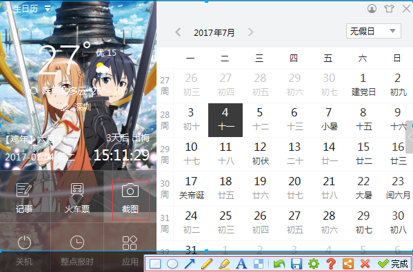 打开人生日历软件或者直接点击桌面右下角的时间日期栏,就会在弹出的人生日历主界面上看到截图小工具,右下角是截图工具的功能区,功能方面和QQ截图大同小异,额外增加设置和分享功能,其中设置选项可以自定义快捷键,非常方便,对比QQ截图,不用打开QQ软件,也不需要同时按住(CTRL+ALT+A)三键*作,选取自己最喜欢的快捷键一键截图,简单粗暴,还有谁!