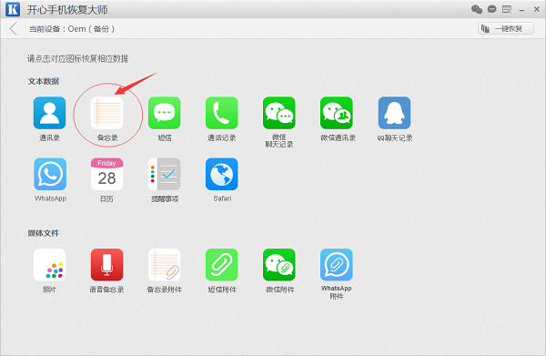 步骤三:随后我们仅进入到数据的选择界面,在这个界面中我们需要选择恢复的数据项,此时我们选择【备忘录】即可。