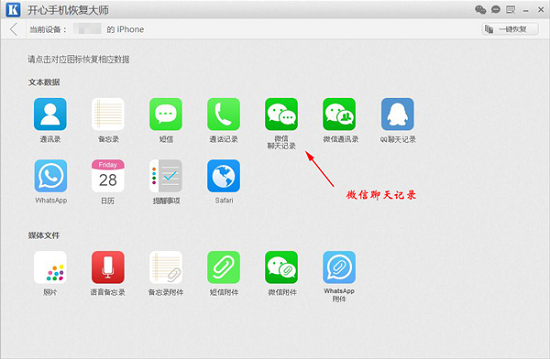 步骤三:此时进入到开心手机恢复大师的数据选择界面。软件支持:微信聊天记录,QQ聊天记录,手机通讯录,短信,备忘录等17种数据的恢复,功能十分强大与全面。这时我们点击【微信聊天记录】即可。