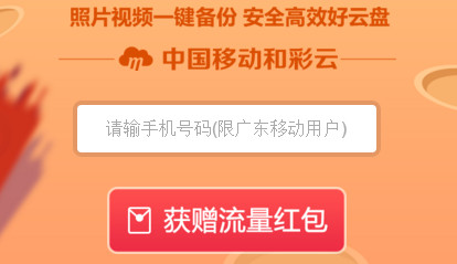活动内容: 活动期间,广东移动用户进入活动页输入手机号码,即可到和彩云手机客户端(和彩云登录)领取1G/7天流量红包。流量红包共200万份,每个用户限获赠1份,先到先得。