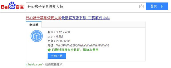 第一步、在恢复苹果手机中删除的照片之前,我们需要将苹果恢复大师这个手机数据恢复软件下载到电脑本地,可以直接百度“开心盒子苹果恢复大师”进行软件的下载;