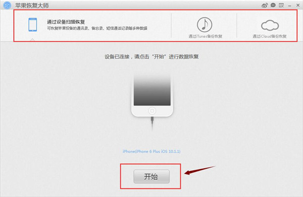 第三步、安装完成之后直接运行开心手机恢复大师,可以看到软件主界面上有三种不同的恢复方法,可以根据自身情况进行选择;此时我们选择默认的第一模式找回删除的苹果手机相片,所以当看到“设备已连接”之后,点击【开始】继续;
