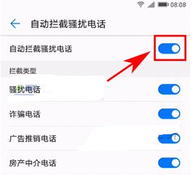 3、接着点击【自动拦截骚扰电话】,然后开启开关后再根据需要开启需要拦截的类型就行了。