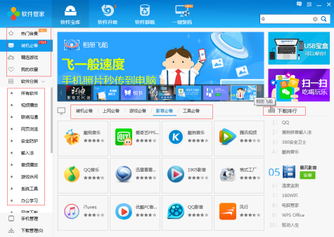 软件管家的软件宝库将市面上的主流软件都进行了归纳分类,其中装机必备选项对于刚刚重装完系统的电脑来说非常方便,像浏览器、输入法、播放器等这些生活工作中必不可少的软件都能一键安装,在软件宝库里,你可以根据不同的分类针对性的选择适合自己的软件,下载排行榜也可作为参考配合使用。