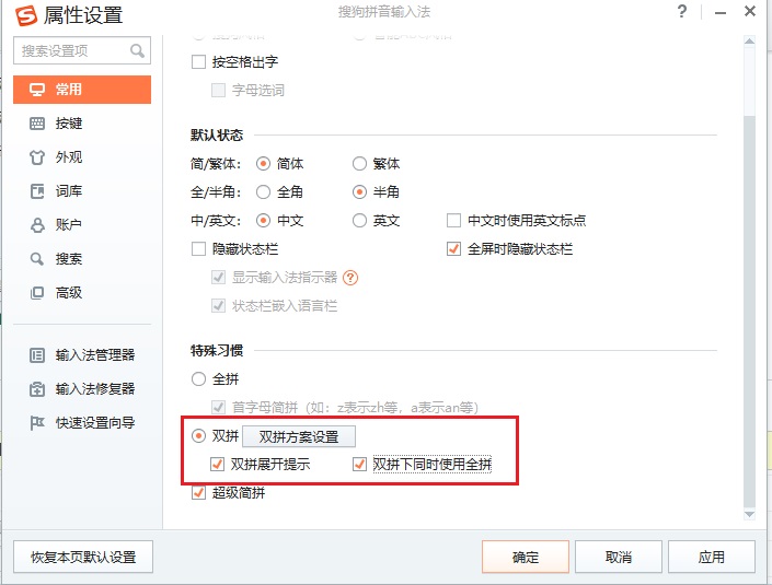 2、最后在设置属性的“特殊习惯”中,将原来选中的“双拼”改为“全拼”,并点击底部的“确定”保存就可以了。