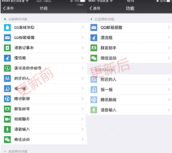 另外,从微信设置中的功能内容上看,能够进行自由启用和关闭的功能仅剩8个,更新前是12个,包括QQ离线消息、语音记事本、通讯录同步助手、视频聊天等4个功能已经移除。
