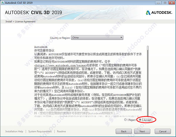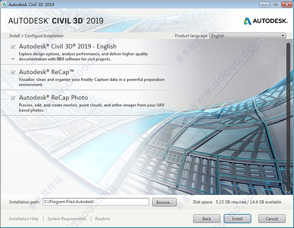 4、选择AutoCAD Civil 3D 2019安装组件,设置安装目录
