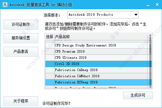 7、运行批量激活工具,勾选需要激活的软件包,点“生成许可”