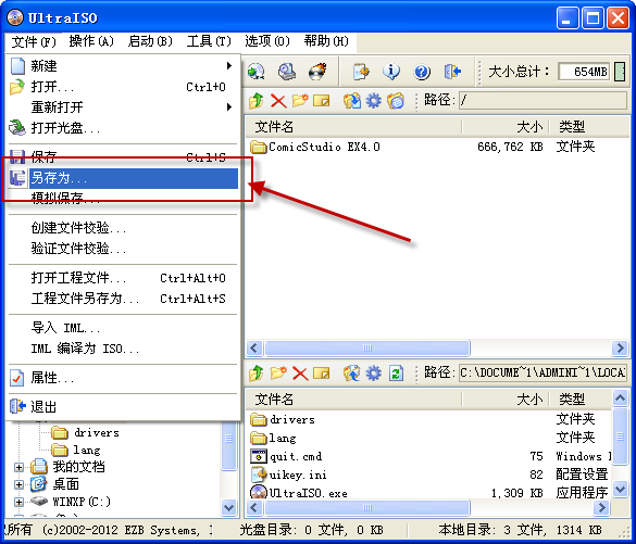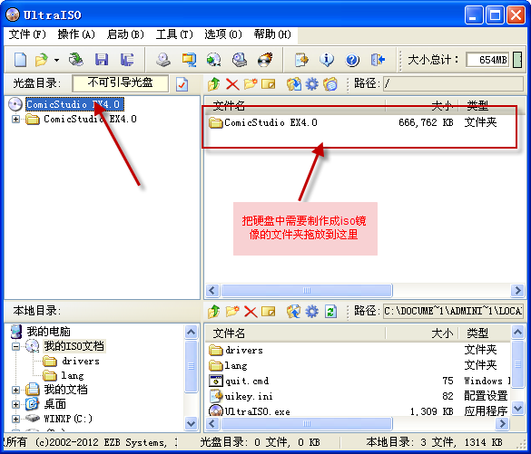 方法很简单用软碟通,打开ULTRAISO.EXE后,把ComicStudio EX4.0整个文件夹拖入到UltraISO界面中即可,如下图。