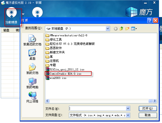 6、使用虚拟光驱加载镜像吧,加载镜像->打开镜像文件所在目录,选定ComicStudio EX4.0.iso镜像文件。使用制作好的镜像文件吧,上面5步帮你省略了。
