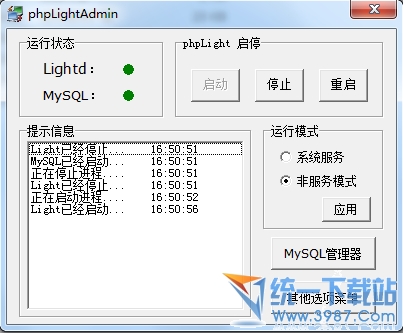 支持系统服务和非服务两种启动方式,自由切换,即使重做系统后亦可使用,直接点启动即可,非常方便的搭建网站服务器,有专门开发的控制面板进行控制程序的启停。