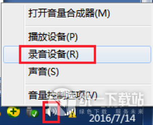 3. 在桌面右下角的小喇叭上点击右键,选择录音设备