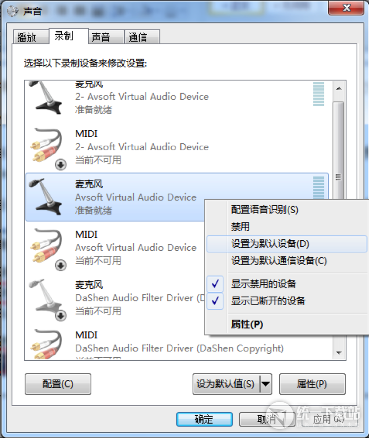 4. 在弹出的声音对话框的录制标签下,右击麦克风Avsoft Virtual Audio Device 选项,选择设置为默认设备