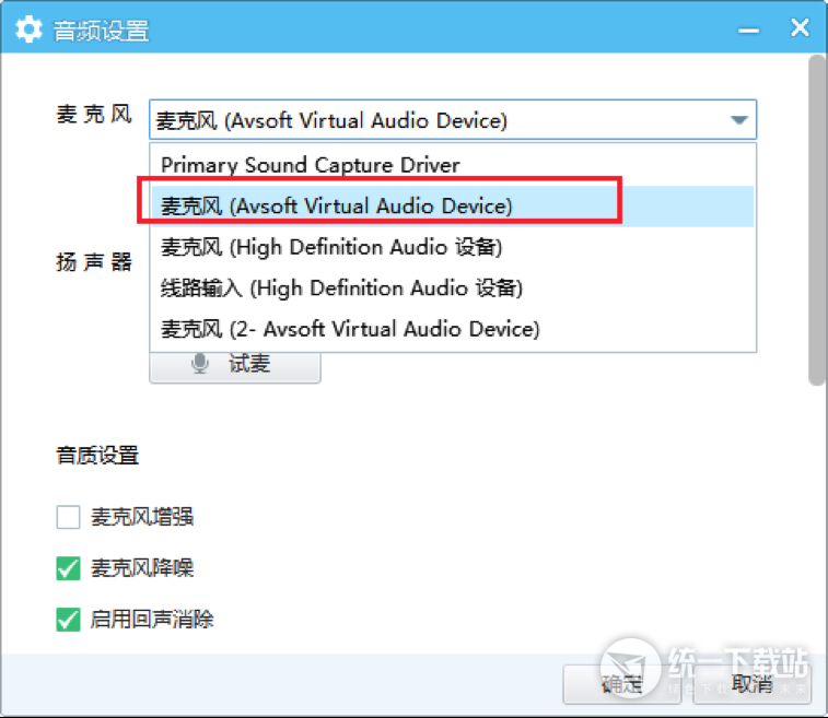 6. 在弹出的窗口中选择音频设置,在弹出的对话框中把麦克风设置为您在上面声音对话框中设置的Avsoft Virtual Audio Device选项.