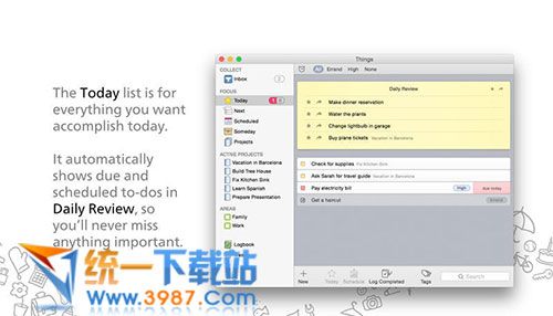 Things of mac严格按照GTD流程来规划人们的任务安排,设计方式也和很多其他 to-do 应用有很大差别。 目前Mac、iPad、iPhone同步上线,支持云端同步to-do列表,同时支持Macbook Pro的Retina显示屏。