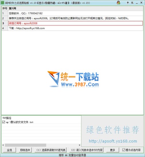 阿P软件之点选剪贴板,用户可将常用语每条一行放置在TXT文档中,软件允许用户选取TXT读入,每条常用语放置在本软件各单元格中,单击单元格即复制此条常用语供用户粘贴。如每条常用语需换行,则编辑TXT时在换行处以半角竖线代替即可,单击本软件单元格时软件会自动替换半角竖线为换行。可使用热键显示或隐藏主界面。
