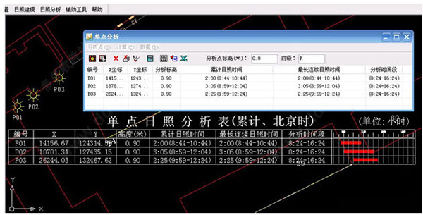 自动计算任意点的日照时间,在图上标注出点位置及编号,生成单点分析结果统计报表
