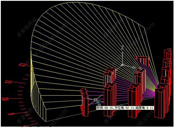太阳光线对指定分析点全天运行的圆锥轨迹,能集中反映出该点的日照情况,快速判定遮挡源,便于日照方案调整