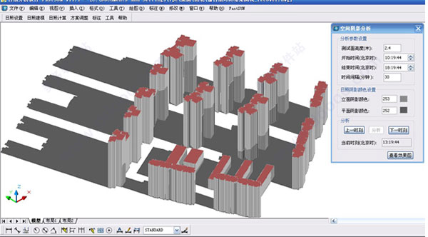 在方案初期,建议大家可以先使用沿线分析功能,如果方案不满足日照要求,则可使用软件提供的建筑物高度推算和建筑物位置推算功能,对方案进行调整;方案后期,则可通过区域分析,窗户端点分析及其它的日照分析方法进行分析出表。