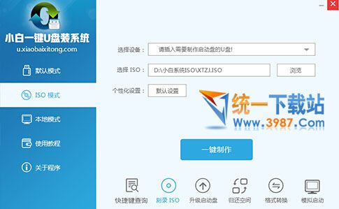 1.安装打开小白一键U盘装系统主界面,可以在左侧看到本软件的主要功能包括默认模式/ISO模式/本地模式,一般我们以默认模式就好,下图为未插入U盘的提示效果。