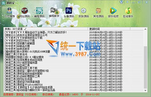 源码宝是一款集合了各种常见的辅助源码的软件,它里面不但包括编程教学、ps教学等应用,而且就算的你乏味的时候,也能进行观看娱乐视频与在线电视,这样是让你能够工作生活两不误! 源码宝功能 今日推荐 网站源码(提供网站源码学习) 编程教学(添加C语言学习教程) 编程源码(各种辅助源码下载) 头像源码(PS头像源码下载) 皮肤源码(QQ空间皮肤源码) 其他源码(各种小游戏辅助、软件等源码) 娱乐视频 在线音乐。